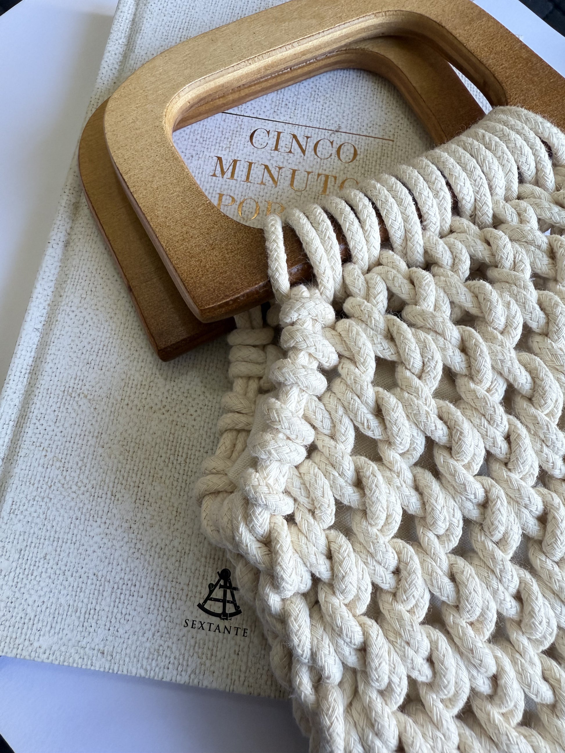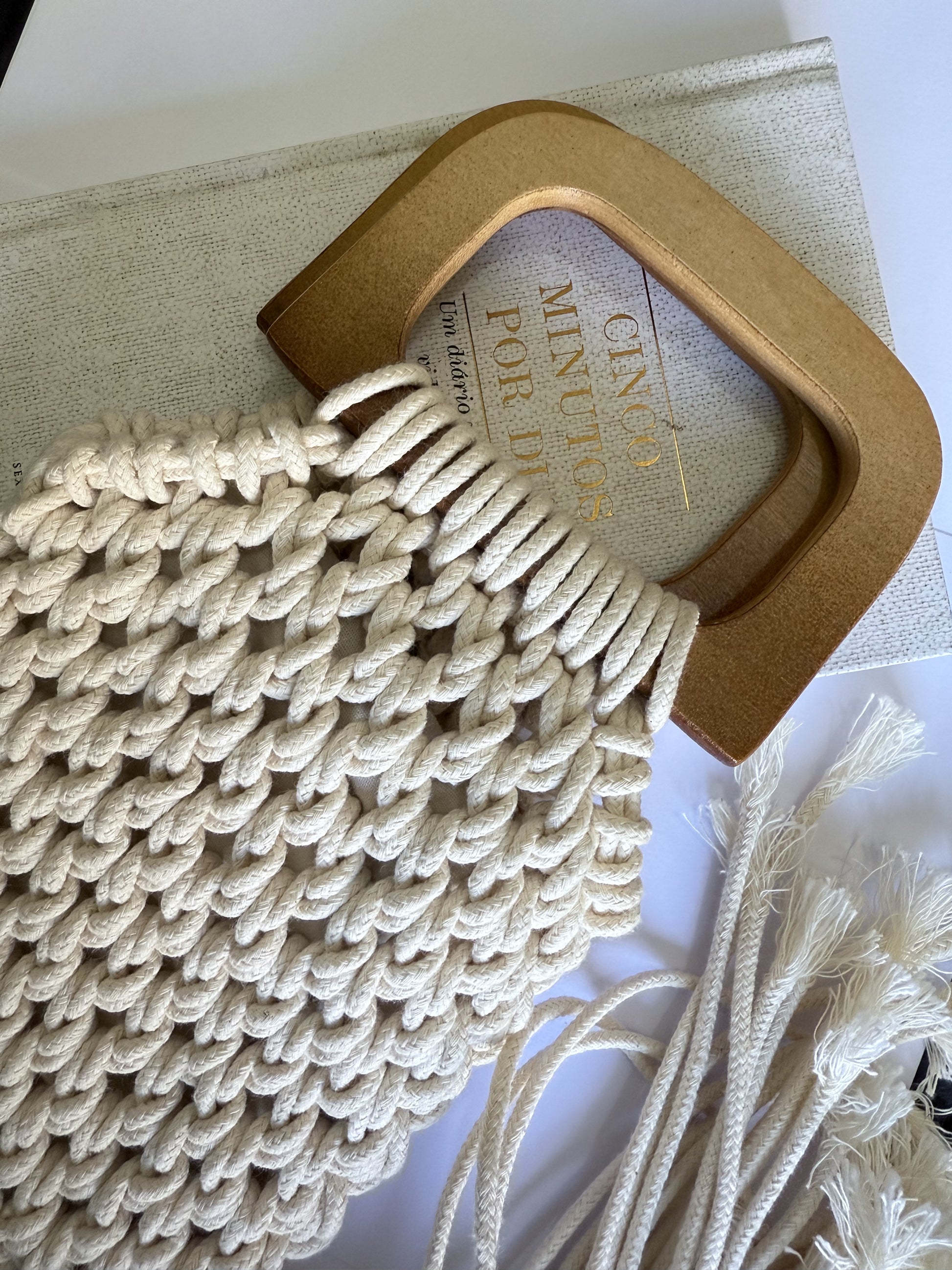 Nossa bolsa em macramê Rio, é toda feita à mão, com corda 100% algodão e alça de madeira , também feita artesanalmente.